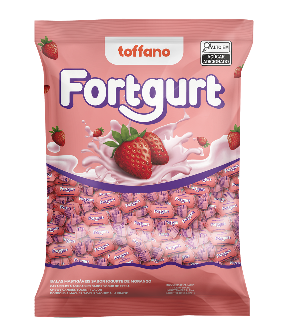 Açúcar Cristal, Xarope de Glucose, Gordura Vegetal, Lecitina de Soja, Ácido Cítrico, Acidulante, Aroma Art. Morango com Iogurte, Aromatizante, Corante Artificial Vermelho Allura FD&C nº 40, Água